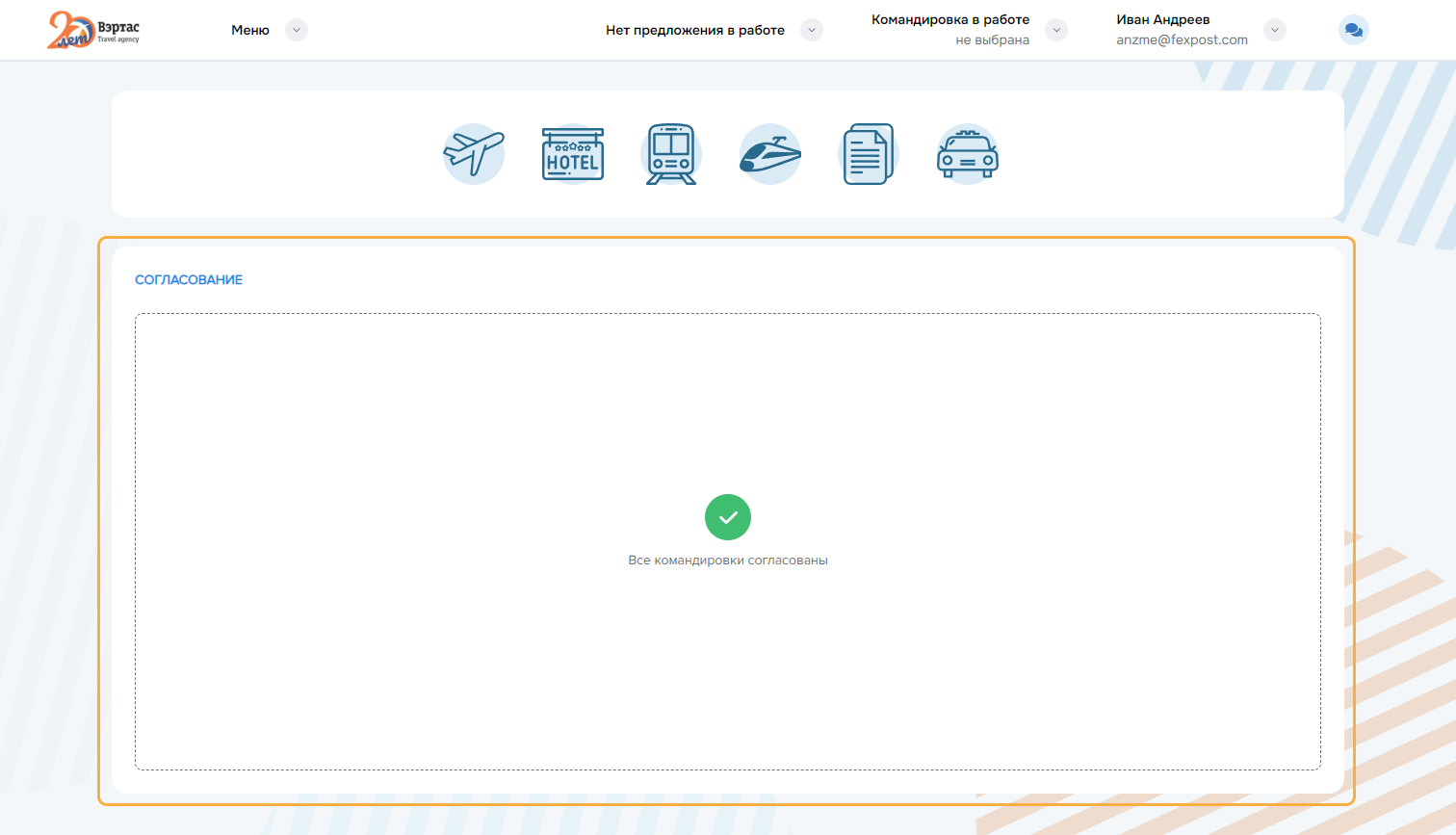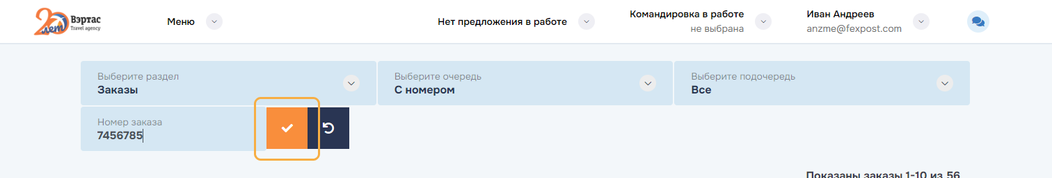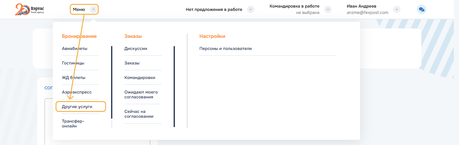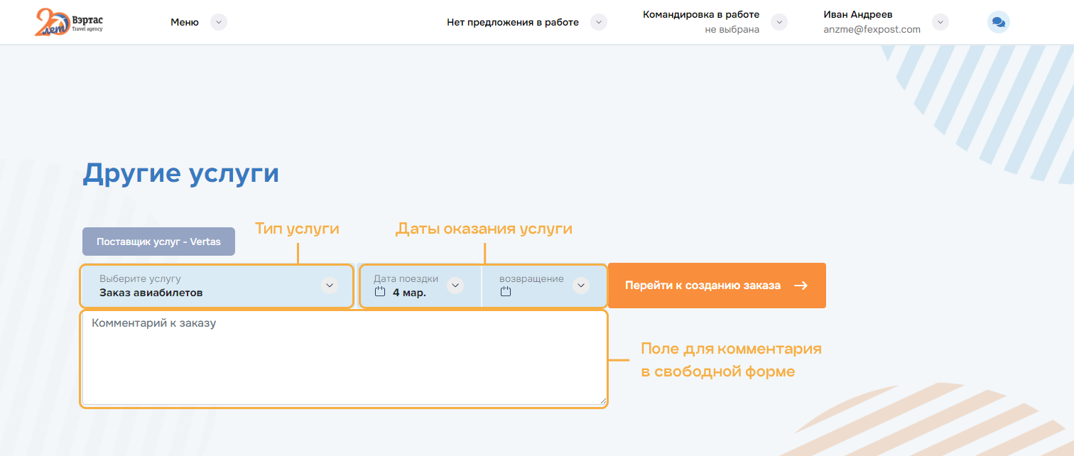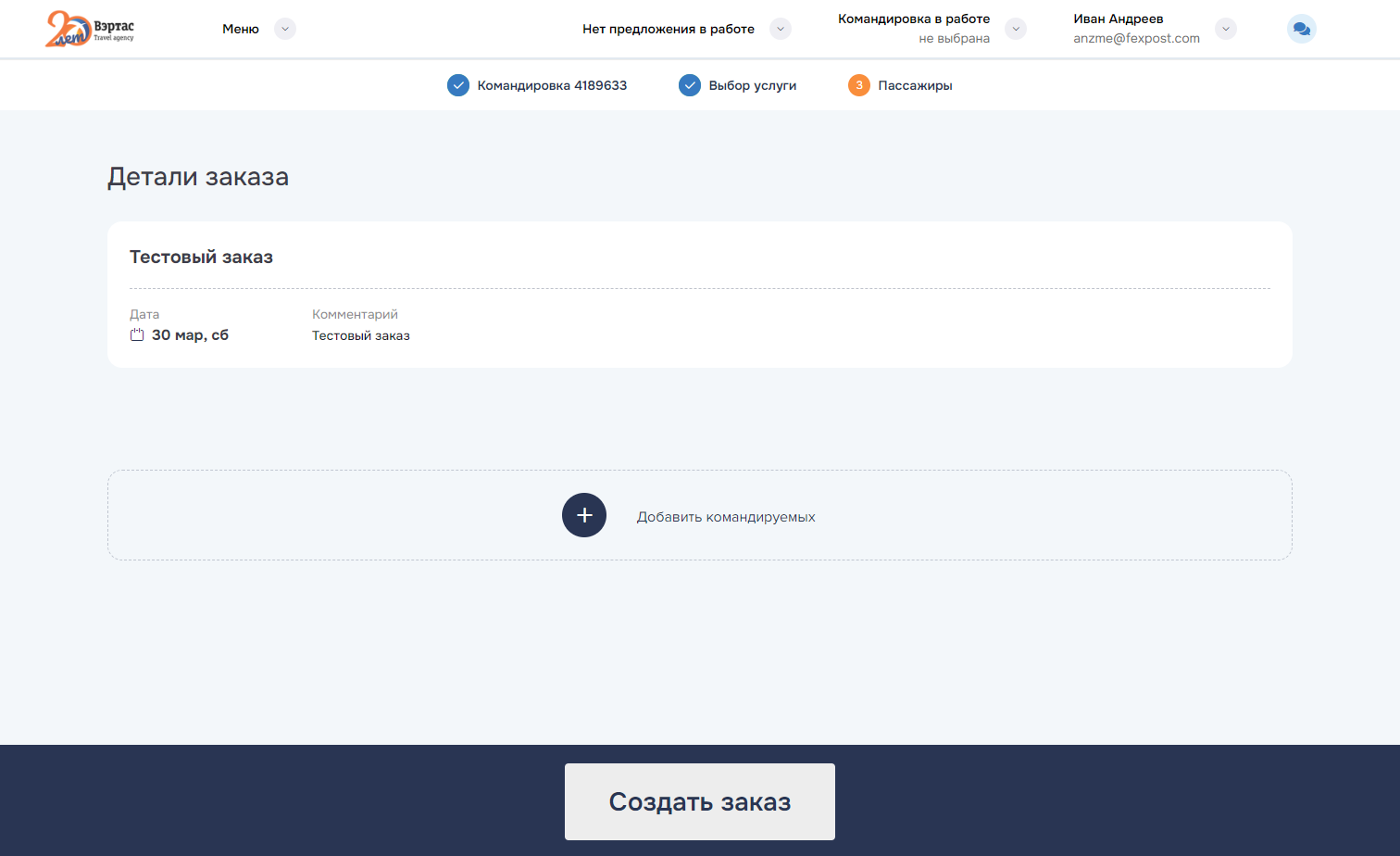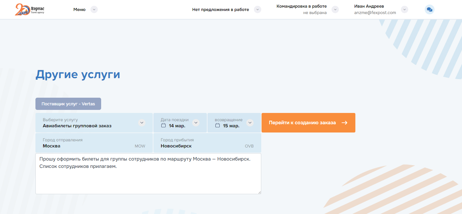 оформление услуг по всем заказам командировки. Успешно оформленные заказы переводятся в состояние