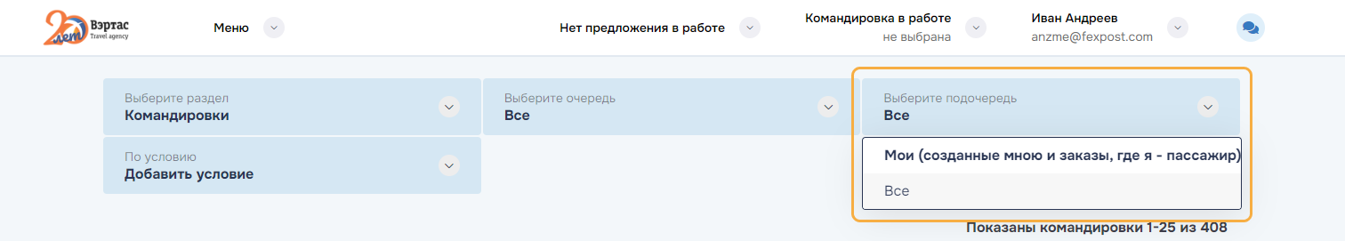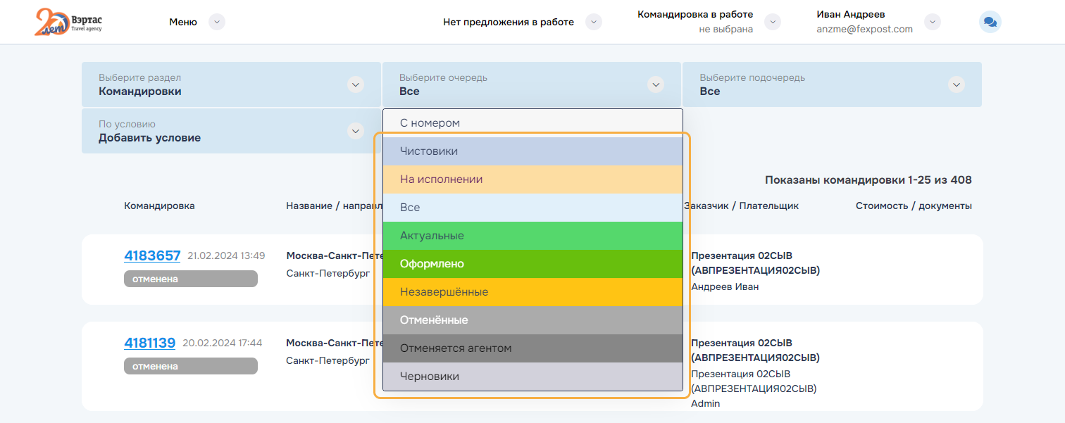 Отменено. Командировка, все заказы которой находятся в статусе