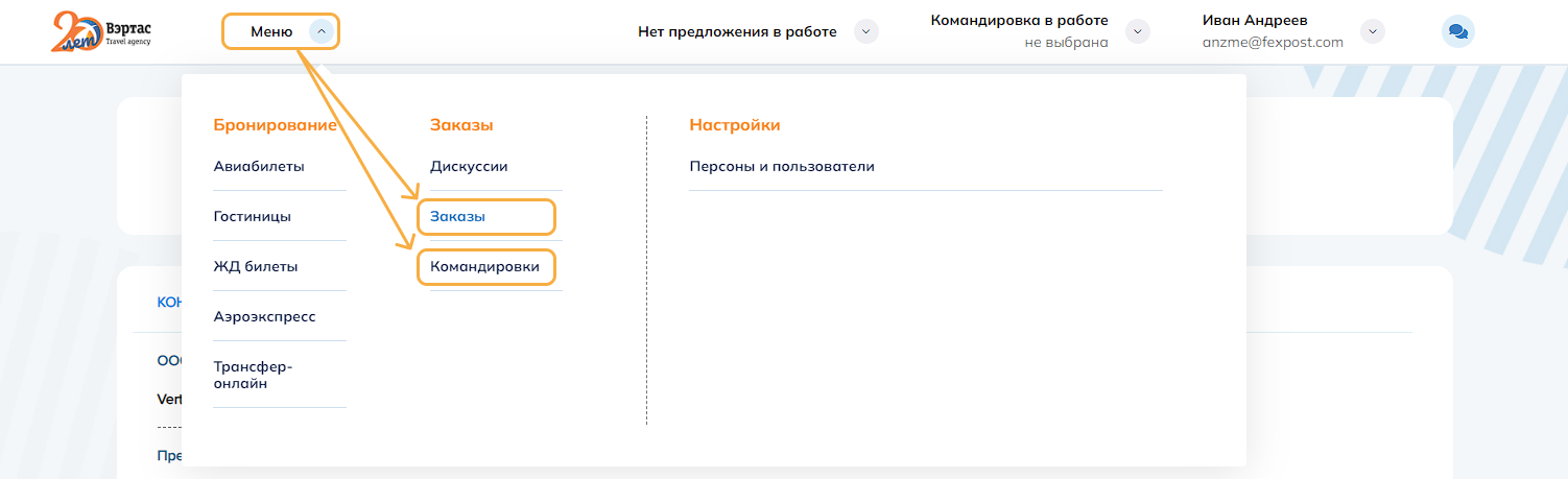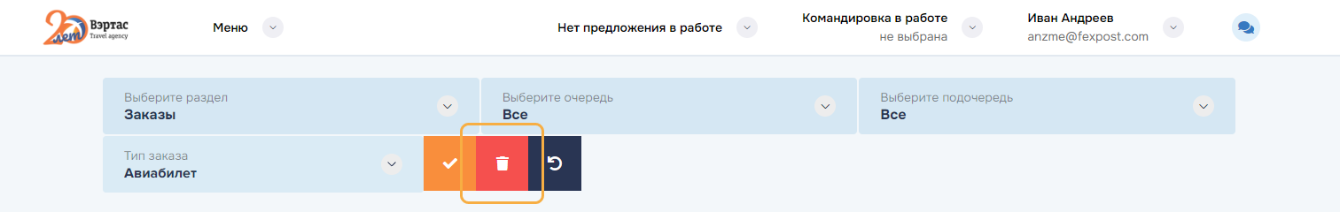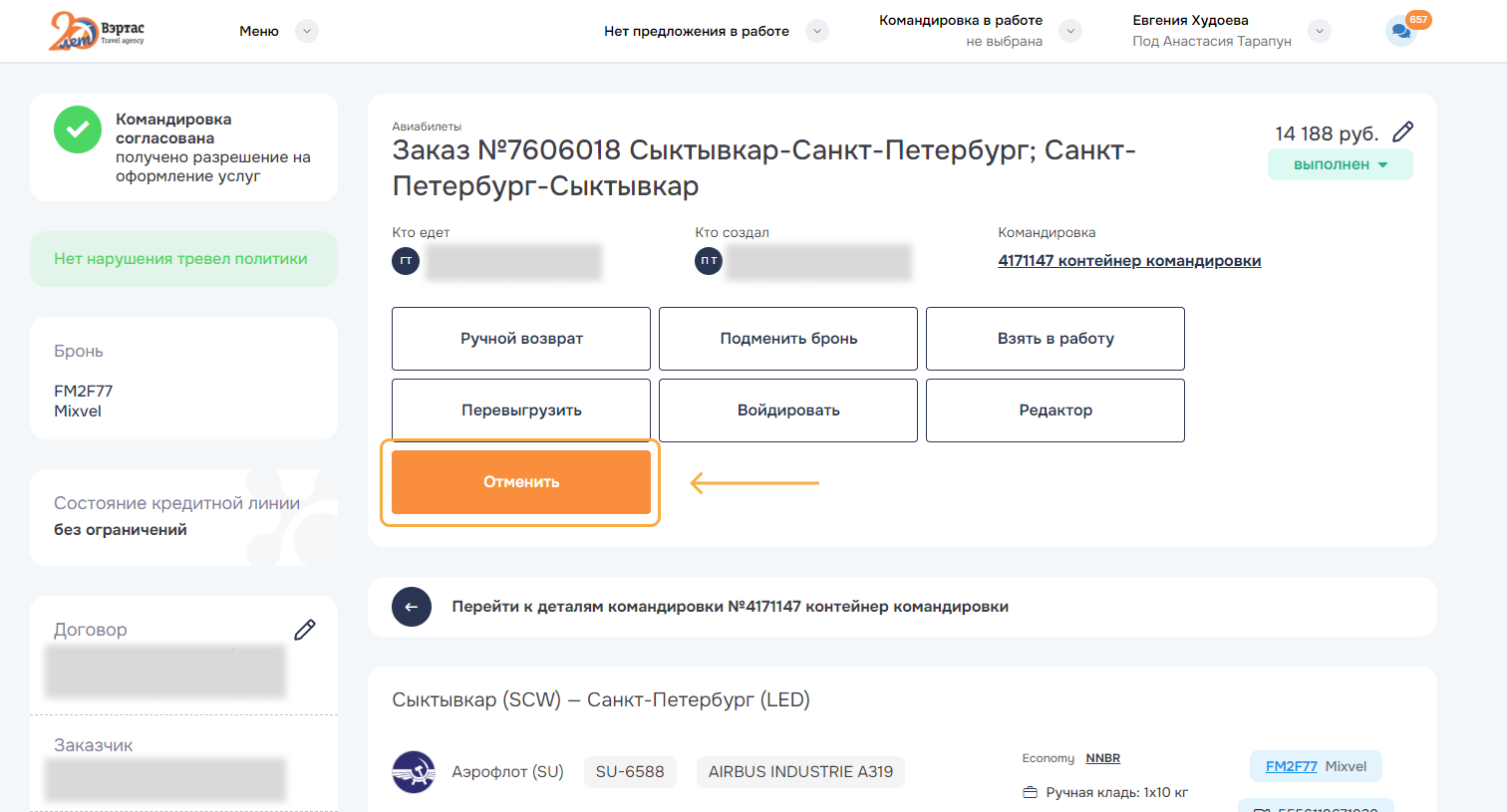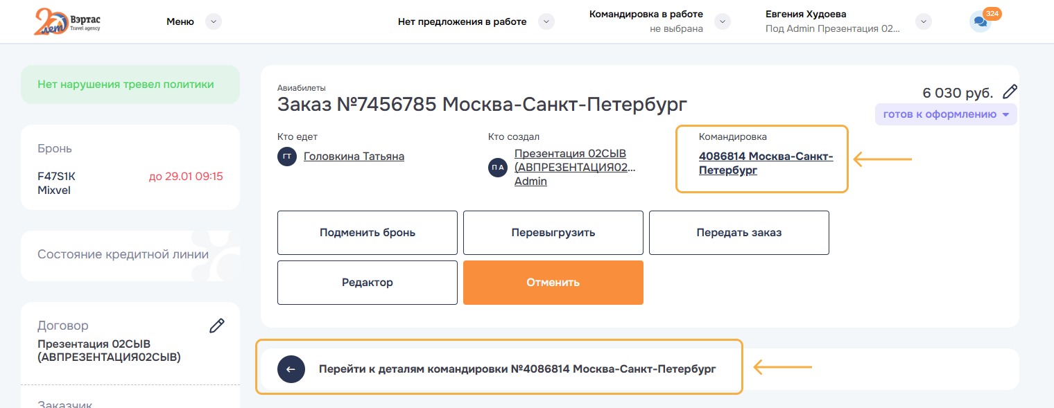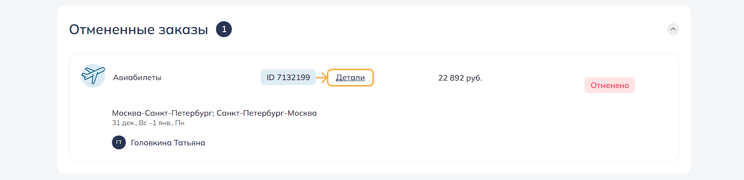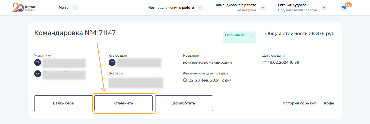 3. ОтменитьОтменить командировку и все брони/заказы командировки. Успешно отмененные заказы переводятся в статус