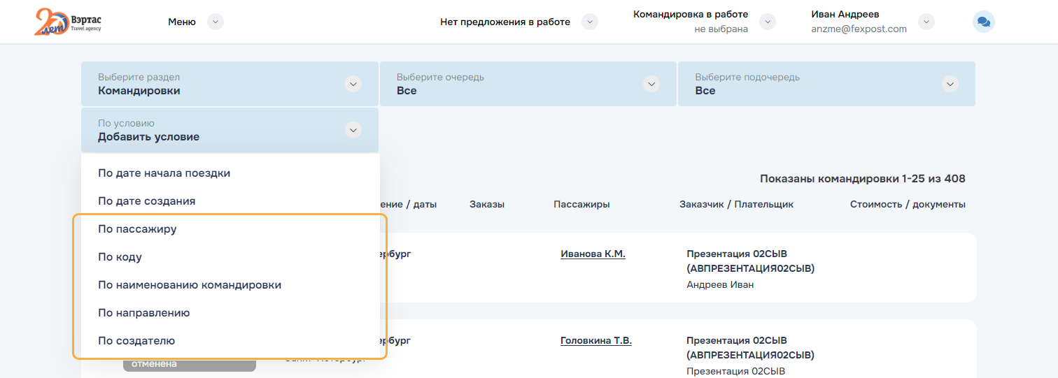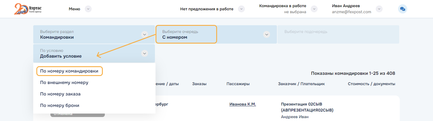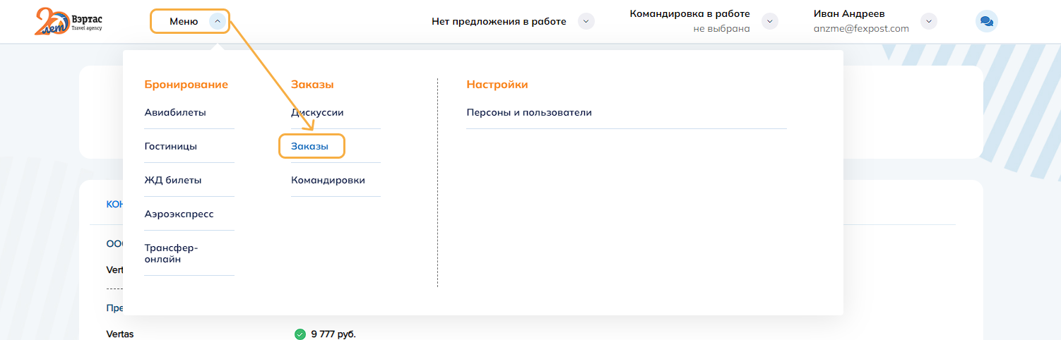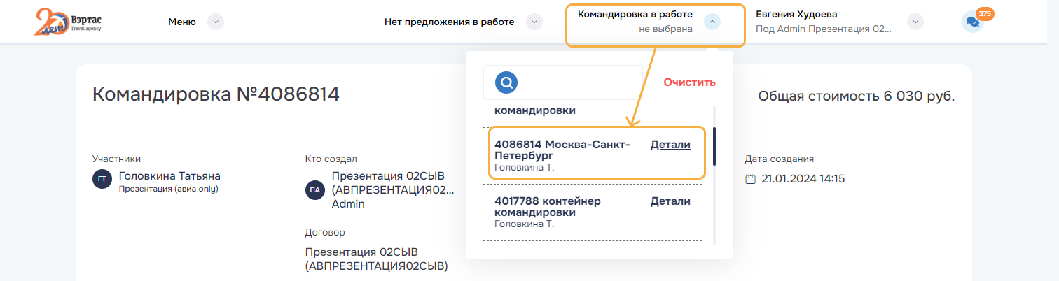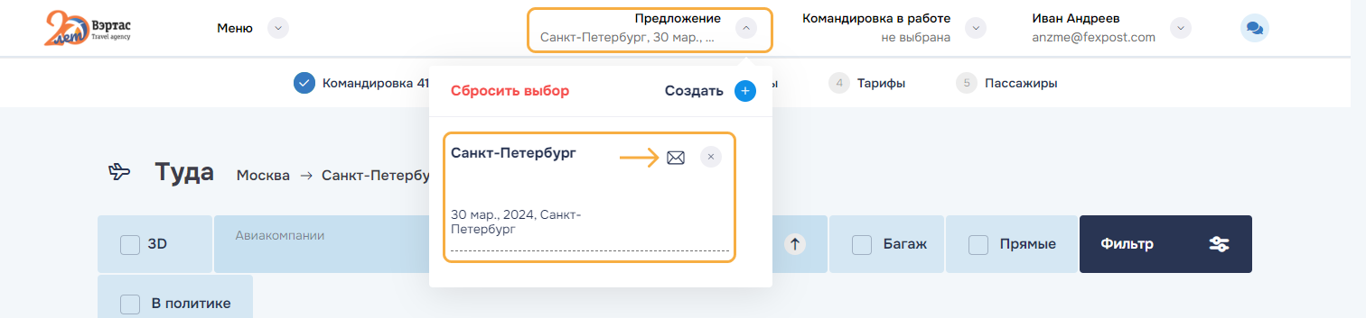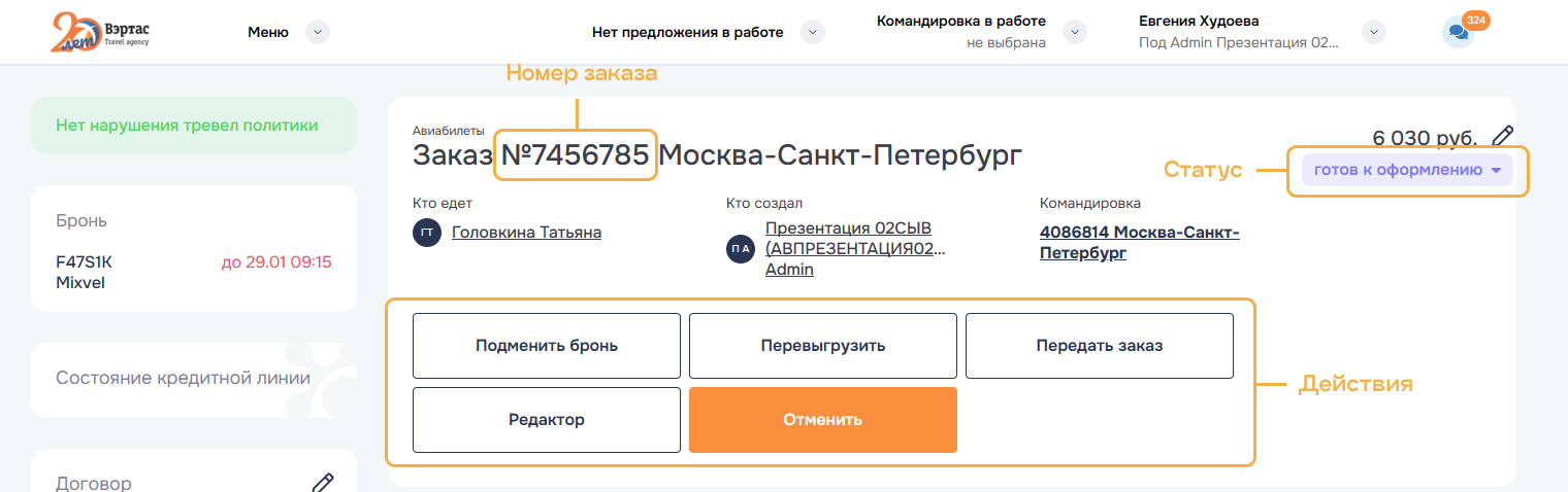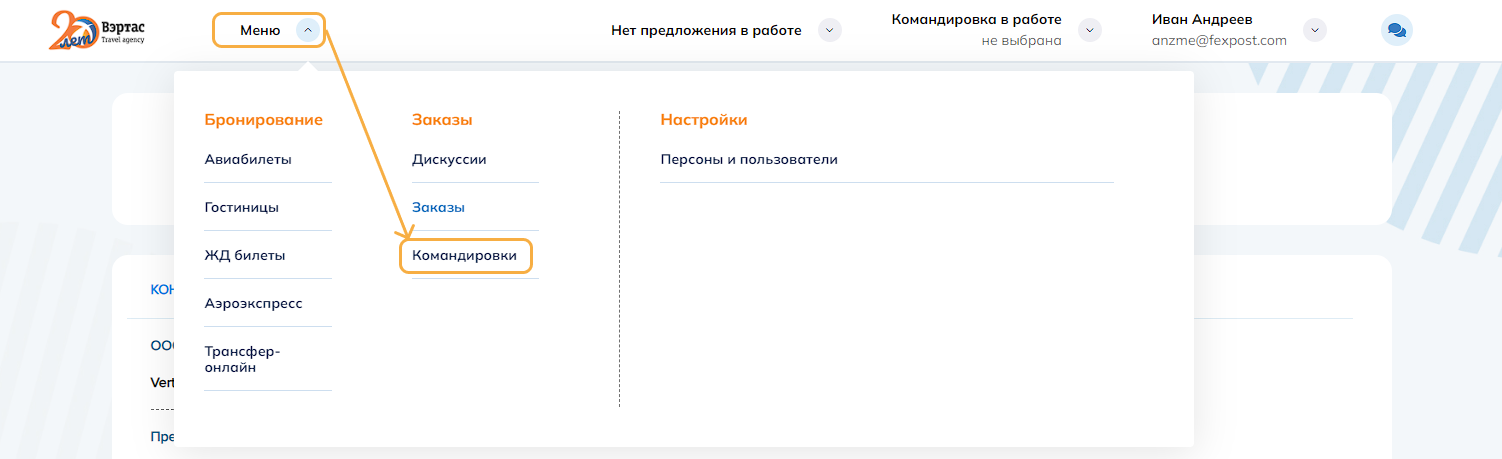 3. ОтменитьОтменить командировку и все брони/заказы командировки. Успешно отмененные заказы переводятся в статус