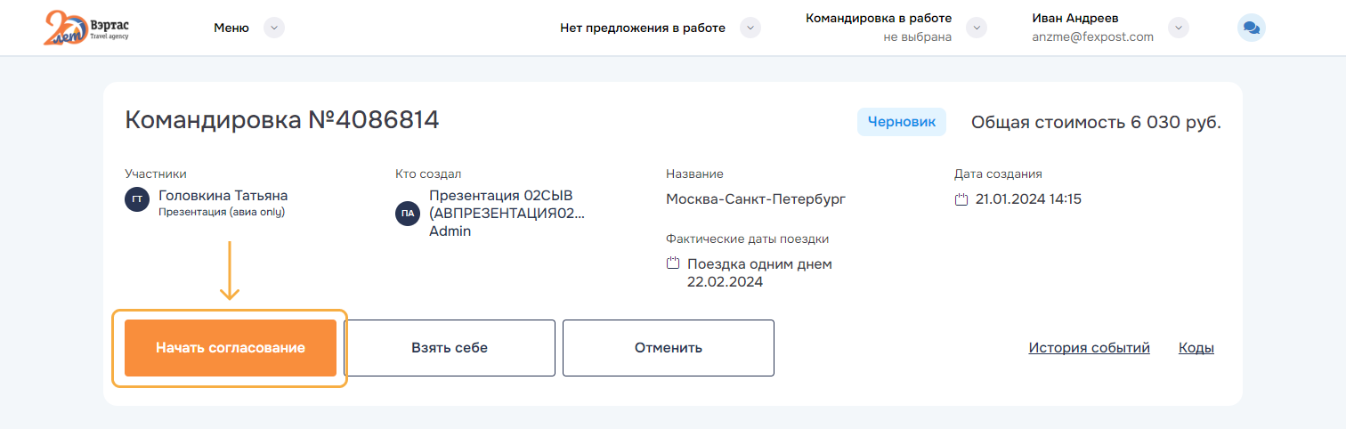 Ожидает реакции агента. Командировка при этом переводится в статус